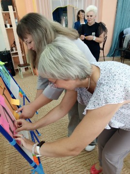 Панихина О.С., воспитатель МБДОУ «Колыванский детский сад «Светлячок» поделилась с коллегами опытом внедрения в свою педагогическую деятельность социо – игровой технологии. Один из приёмов данной технологии, который представил педагог – рисование рисунка по кругу. Каждый участник задумывает композицию и начинает её рисовать, через определённой время (15 – 20 секунд) по команде педагога, рисунок передаётся по кругу и все участники добавляют к нему свои детали до тех пор, пока он не вернётся к своему хозяину. Таким образом, находясь в одной команде участники должны понять основной замысел и продолжить его.