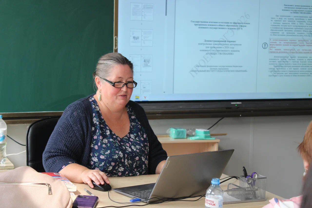 Практико-ориентированный блок продолжила Лилия Владимировна Ходункова, также учитель МБОУ «Колыванская СОШ №1». Опираясь на свой опыт работы в региональной предметной комиссии по обществознанию, она провела анализ типичных ошибок выпускников, допущенных на ЕГЭ в прошедшем учебном году. Эта информация имеет высокую практическую ценность для выстраивания системы подготовки учащихся к экзамену.