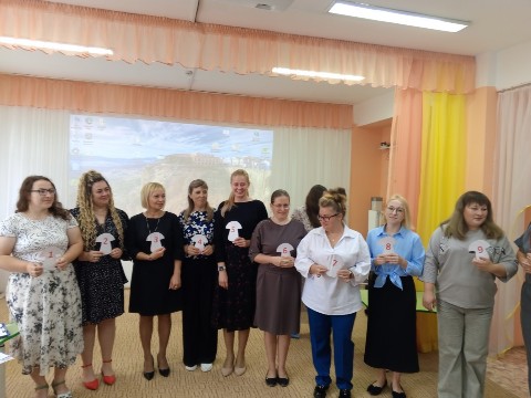 После занятия педагогам был представлен психологический тренинг «Профилактика эмоционального выгорания педагогов в период введения ФОП ДО». Во время тренинга коллеги потренировались здороваться по-разному, представили свою работу в виде лошадки и в завершении получили звезду с пожеланиями.